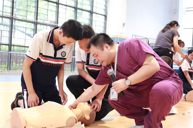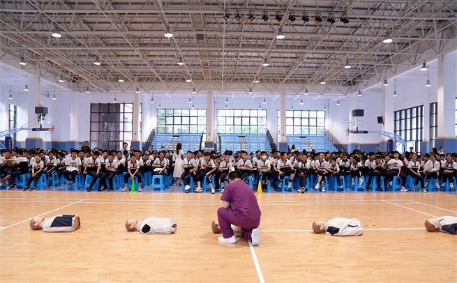 同學(xué)們集體學(xué)習(xí)急救知識——心肺復(fù)蘇術(shù)。院方供圖