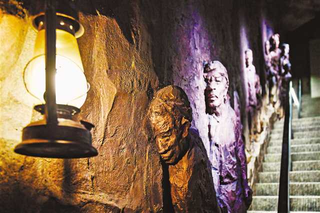 階梯右側(cè)的雕塑,是轟炸結(jié)束后避難者逃出隧道,涌向洞外的樣子。他們有的高舉右手,指著洞外的陽(yáng)光匆匆奔去。有的爬行在階梯上,仰著頭呼吸新鮮空氣……