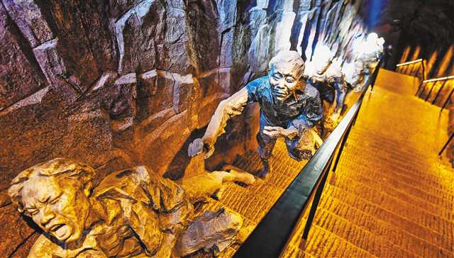 5月28日,重慶大轟炸“六五”大隧道慘案遺址的負(fù)二層展區(qū)內(nèi)的避難者群雕。