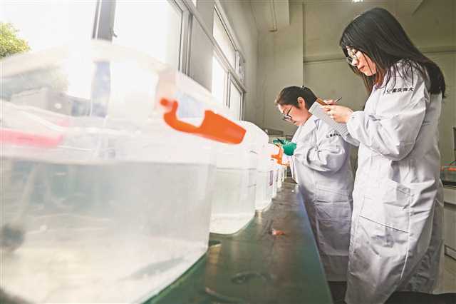 西南大學(xué)水產(chǎn)學(xué)院漁業(yè)資源與保護(hù)學(xué)實(shí)驗(yàn)室,科研人員查看魚苗生長情況。