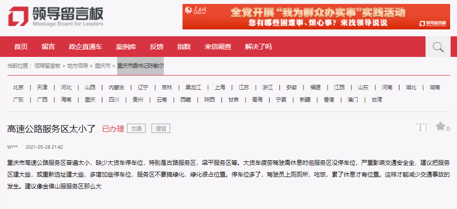 留言稱,重慶市高速公路服務區(qū)普遍太小,缺少大貨車停車位,特別是古路服務區(qū),梁平服務區(qū)等。大貨車駕駛員疲勞駕駛需休息時,但服務區(qū)停車位緊張,影響交通安全。為此,他建議把服務區(qū)建大或重新選址增加停車位,以減少交通事故的發(fā)生。