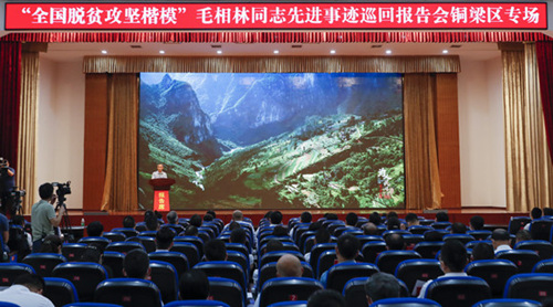 “全國脫貧攻堅楷模”毛相林同志先進(jìn)事跡巡回報告會在銅梁舉行。通訊員 陳慶 攝