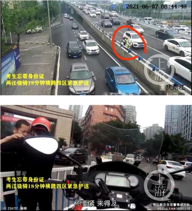 民警跨越兩江新區(qū)-渝北-江北-渝中四個區(qū),用時18分鐘,終于在8:58時將考生身份證成功送到考點。