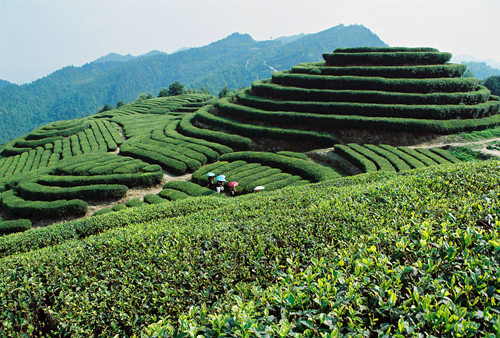 在那一層層茶梯之間,數(shù)名采茶女戴著布衣遮陽帽,腰挎圓筒形竹質(zhì)茶簍,來回穿梭茶樹其間,手指快速翻飛,在茶樹頭上拔芽打尖。歡笑聲、歌唱聲在山坡回旋,點(diǎn)綴在茶園深處,構(gòu)成了茶山上一幅幅美麗的風(fēng)景。
