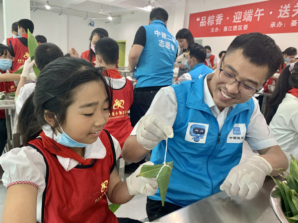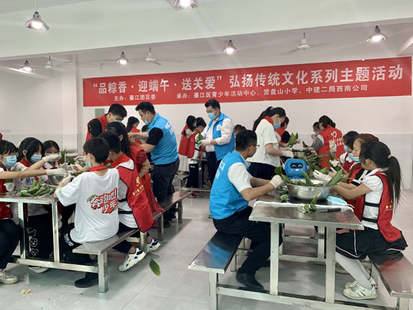 青年志愿者和留守兒童、困境兒童一起包粽子。中建二局西南公司供圖