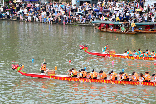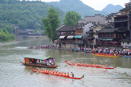 賽龍舟是端午節(jié)最重要的節(jié)日民俗活動之一,自2010年開始,每逢端午佳節(jié),秀山縣都將與湖南省花垣縣、貴州省松桃縣輪流主辦邊區(qū)龍舟賽,以展現(xiàn)邊區(qū)人民團結友誼和奮發(fā)進取的精神,今年由秀山縣主辦第十屆渝湘黔三。ㄊ校┻厖^(qū)龍舟邀請賽。本次比賽共43支龍舟隊參賽,每支隊伍22名隊員,分男子組和女子組兩個組別進行。比賽采取標準龍舟400米直道競賽,采用電子計時與抽簽確定比賽順序依次競技,賽制按照中國龍舟協(xié)會審定的最新《龍舟競賽規(guī)則》執(zhí)行,施行初賽、決賽,用時最少的隊伍獲勝。(劉政寧、田坤)