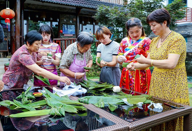 6月13日,在浙江省湖州市長興縣小浦鎮(zhèn)方一村一家民宿,當(dāng)?shù)卮迕窈陀慰鸵黄鹬谱鳟?dāng)?shù)貍鹘y(tǒng)美食“烏米端午粽”。