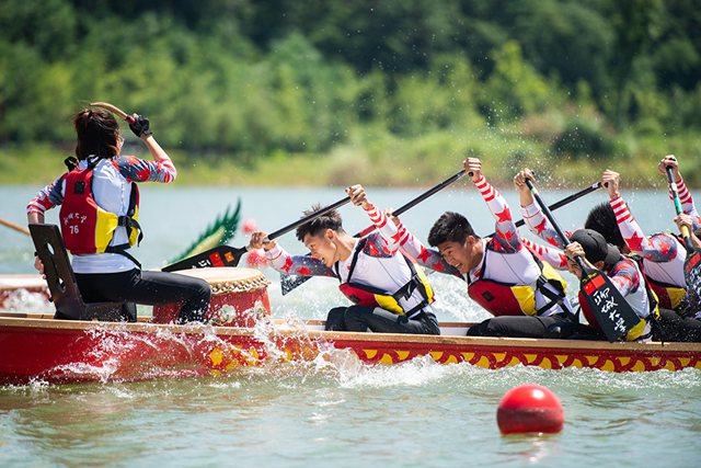 6月13日,在湖南省汨羅市屈子文化園舉行的龍舟表演賽上,參賽龍舟隊員在比賽中奮勇爭先。