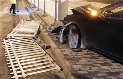 在現(xiàn)場(chǎng),一輛黑色轎車撞倒道路中央的一片隔離護(hù)欄,車頭、護(hù)欄嚴(yán)重受損,駕駛員頭部受輕微傷。民警對(duì)駕駛員進(jìn)行檢測(cè),排除了他酒駕、毒駕嫌疑。
