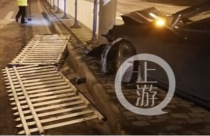 在現(xiàn)場,一輛黑色轎車撞倒道路中央的一片隔離護欄,車頭、護欄嚴重受損,駕駛員頭部受輕微傷。民警對駕駛員進行檢測,排除了他酒駕、毒駕嫌疑。