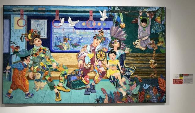 走進(jìn)展廳,2017級(jí)壁畫(huà)專(zhuān)業(yè)的韓汶羽采用浪漫主義手法帶來(lái)的壁畫(huà)《十七點(diǎn)的車(chē)廂》,就徹底放飛了想象。其中的大人、小孩都衣著鮮艷不說(shuō),車(chē)廂里看似不可思議地出現(xiàn)了猴子等小動(dòng)物!皠(dòng)物是孩子的想象。”韓汶羽面對(duì)鏡頭講述了自己創(chuàng)作的幕后故事,“累了一天睡著了的大人,做的夢(mèng)是向陽(yáng)而生,所以他衣服上全都是大朵大朵的向日葵……”