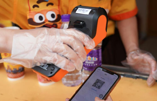 6月16日,北京歡樂谷一商戶使用POS機(jī)對(duì)使用數(shù)字人民幣的消費(fèi)者進(jìn)行掃碼收款。