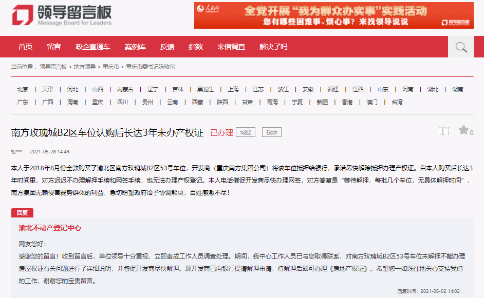 原來,該網(wǎng)友5月28日在留言中反映,他于2018年8月全款購買了渝北區(qū)南方玫瑰城一車位,開發(fā)商將該車位抵押給銀行,承諾盡快解除抵押辦理產(chǎn)權(quán)證。可是,購買后長達3年時間,對方遲遲不辦理解押手續(xù)和網(wǎng)簽手續(xù),也無法辦理產(chǎn)權(quán)登記。經(jīng)多次催促,對方答復“等待解押,每批幾個車位,無具體解押時間。”