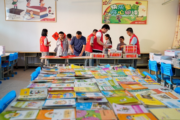 學生和志愿者們在“紅色圖書角”整理書籍。江北團區(qū)委供圖
