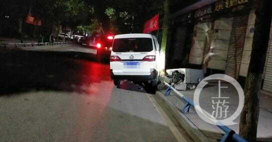 在現(xiàn)場,一輛白色面包車停在路邊,車身受損較重,路邊配電箱被撞倒。所幸駕駛員系了安全帶且車速不快,事故并未造成人員傷亡。