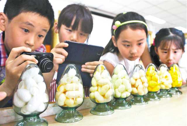 小學生在西南大學家蠶基因國家重點實驗室近距離觀察彩色蠶繭。(攝于2015年6月14日)特約攝影 秦廷富/視覺重慶