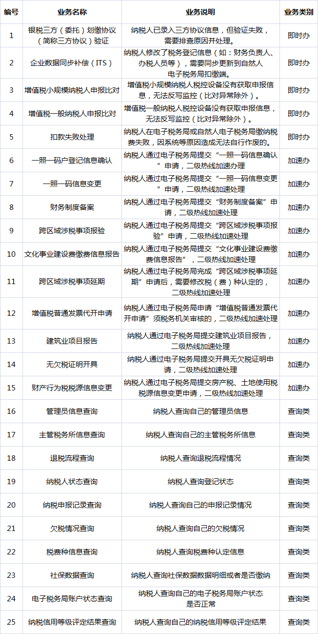 二級(jí)熱線電話辦稅事項(xiàng)清單