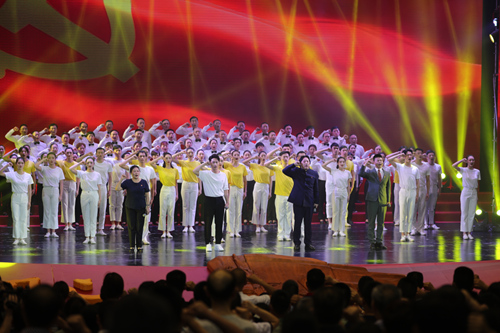 舞蹈《心中的旗幟》、群舞《春風雨露》、音樂劇《念念不忘》、獨唱《以人民為天》等節(jié)目也陸續(xù)上演。最后,文藝演出在合唱歌舞《我宣誓》中落下帷幕,舞臺上下高唱入黨誓詞,表達永遠聽黨話,永遠跟黨走的堅定信念。(劉政寧、蔣海濤)