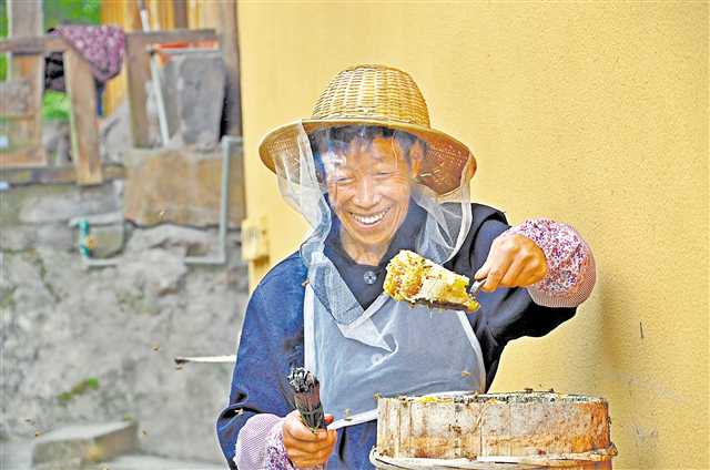 脫貧戶譚文祥正在取蜜。