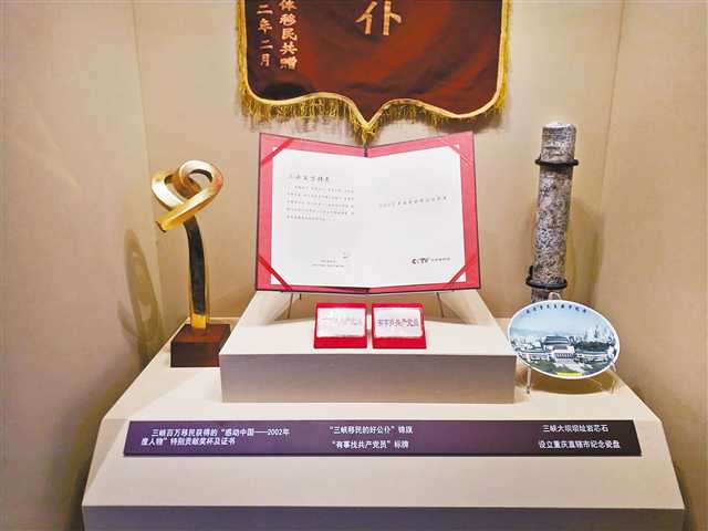 授予三峽百萬移民的“感動(dòng)中國——2002年度人物”特別貢獻(xiàn)獎(jiǎng)杯及證書、設(shè)立重慶直轄市紀(jì)念瓷盤等展品。
