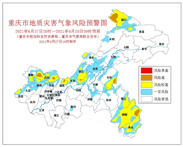 人民網(wǎng)重慶6月27日電 6月27日16時,重慶市規(guī)劃和自然資源局、重慶市氣象局聯(lián)合發(fā)布全市地質(zhì)災(zāi)害氣象風(fēng)險預(yù)警。