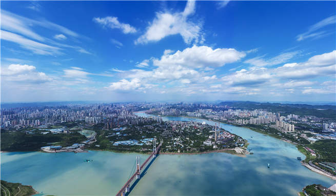 藍天白云下的九龍半島。九龍坡區(qū)生態(tài)環(huán)境局供圖