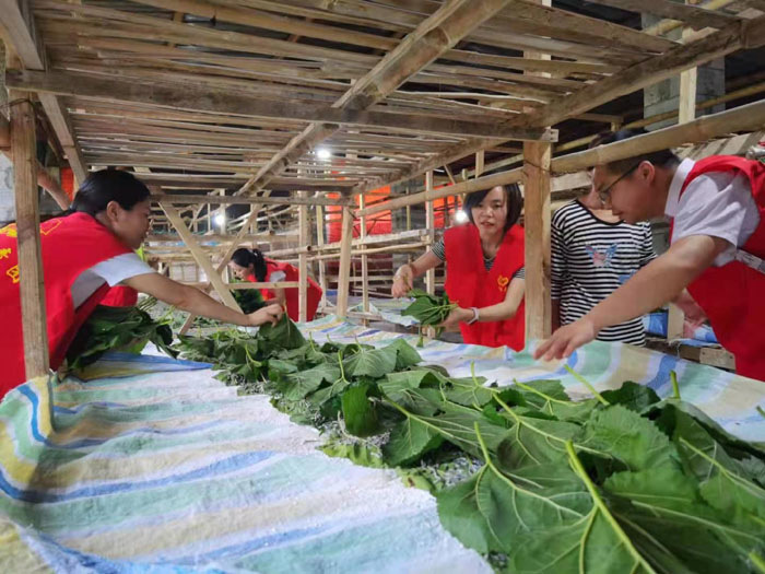 共青團(tuán)黔江區(qū)委派駐蓬勃社區(qū)駐村隊(duì)員陳濤得知脫貧戶余紹云正值養(yǎng)蠶忙碌時(shí)節(jié),勞動力較為短缺的情況,團(tuán)區(qū)委便組織了10余名青年志愿者去幫助其采摘桑葉,促進(jìn)產(chǎn)業(yè)發(fā)展。桑田里,大家齊心協(xié)力,志愿者們有的摘桑葉,有的背背簍,盡管天氣炎熱,但大家干勁十足。桑葉采摘完,大家又洗手消毒忙著給蠶寶寶投食,同時(shí)還向養(yǎng)蠶戶、駐村工作隊(duì)員請教養(yǎng)蠶技術(shù)和注意事項(xiàng)。