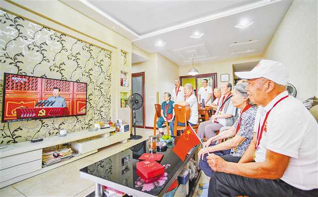 7月1日,綦江區(qū)古南街道綦齒社區(qū),黨齡50年以上的老黨員們聚在一起收看慶祝中國(guó)共產(chǎn)黨成立100周年大會(huì)盛況。特約攝影 陳星宇/視覺(jué)重慶