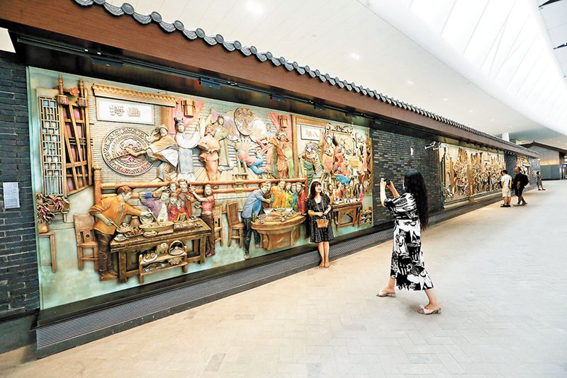 布置在出發(fā)大廳“天府巷”的壁畫(huà)作品,也十分精彩。記者看到,壁畫(huà)上有正在刺繡、吹糖人的非遺傳承人,有品茶的市民,有玩滑板的青少年,描繪出成都百姓多姿多彩的美好生活。“川美藝術(shù)家非常了解成都人的生活狀態(tài),因此在創(chuàng)作壁畫(huà)《潮流都市》《蓉城意味》等作品時(shí)很有感覺(jué)。”張杰介紹,這些壁畫(huà)采用線(xiàn)描造型、數(shù)碼技術(shù)、傳統(tǒng)鑄銅工藝等技法,將歷史、現(xiàn)在、未來(lái)串聯(lián)起來(lái),用豐富的視覺(jué)效果,體現(xiàn)成都獨(dú)有的傳統(tǒng)韻味和當(dāng)代氣息。