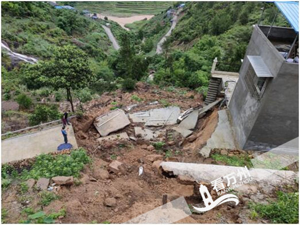 7月11日10時許,斜坡體中前部出現(xiàn)滑塌,11時許出現(xiàn)大面積滑動,造成道路移位垮塌30米,2棟房屋被移位淹埋。