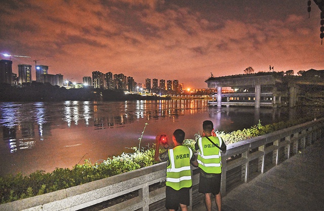 7月13日凌晨,沙坪壩區(qū)磁器口,工作人員正在沿江區(qū)域巡邏,查看水位。首席記者 龍帆 攝/視覺(jué)重慶