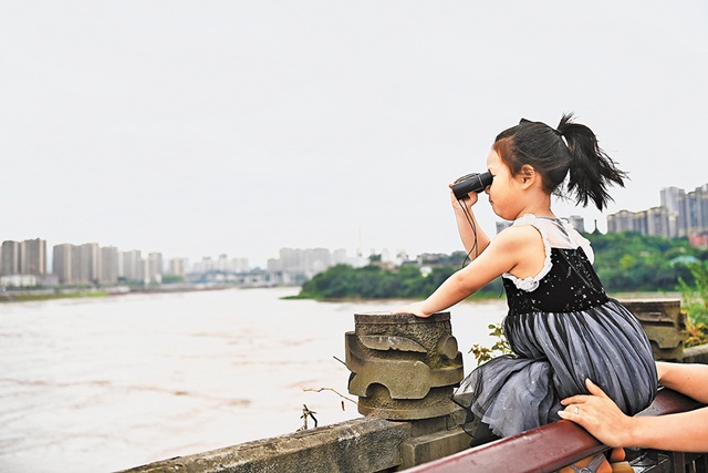 7月12日中午,“嘉陵江2021年第1號(hào)洪水”過(guò)境磁器口。圖為一位小朋友在家長(zhǎng)的保護(hù)下手持望遠(yuǎn)鏡“打望”不斷上漲的洪水。記者 蘇思 攝/視覺(jué)重慶