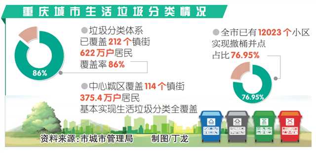 目前,全市公共機(jī)構(gòu)已實(shí)現(xiàn)垃圾分類全覆蓋,城市生活垃圾分類體系已覆蓋212個(gè)鎮(zhèn)街、622萬(wàn)戶居民,覆蓋率86%,其中中心城區(qū)基本實(shí)現(xiàn)全覆蓋。另一方面,全市已有12023個(gè)小區(qū)實(shí)現(xiàn)撤桶并點(diǎn),其中渝北區(qū)、兩江新區(qū)、梁平區(qū)、秀山縣等6個(gè)區(qū)縣樓層撤桶率達(dá)100%。
