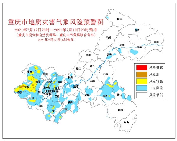 人民網(wǎng)重慶7月17日電 7月17日16時,重慶市規(guī)劃和自然資源局、重慶市氣象局聯(lián)合發(fā)布全市地質(zhì)災(zāi)害氣象風險預(yù)警。