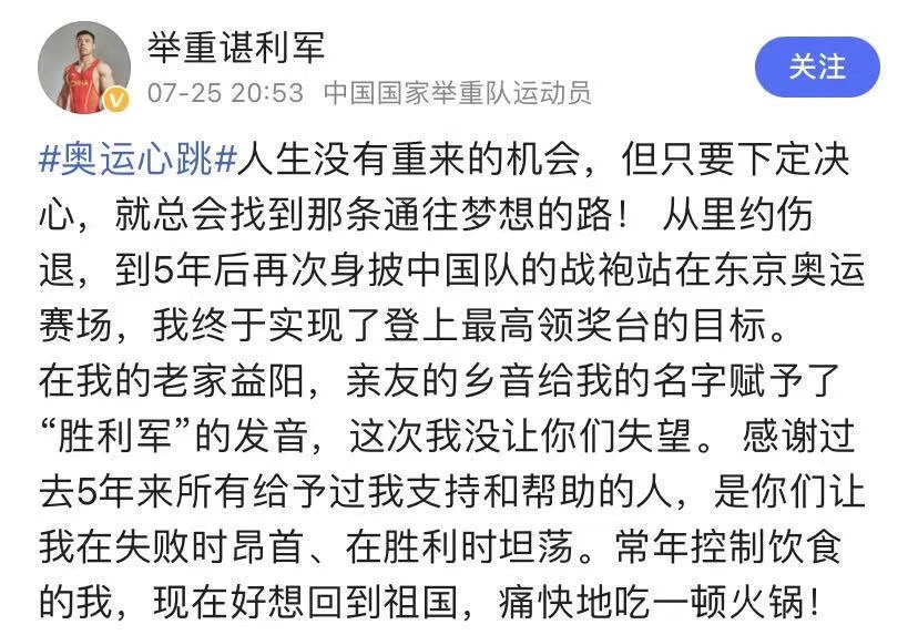 諶利軍斬獲金牌后:好想痛快地吃一頓火鍋