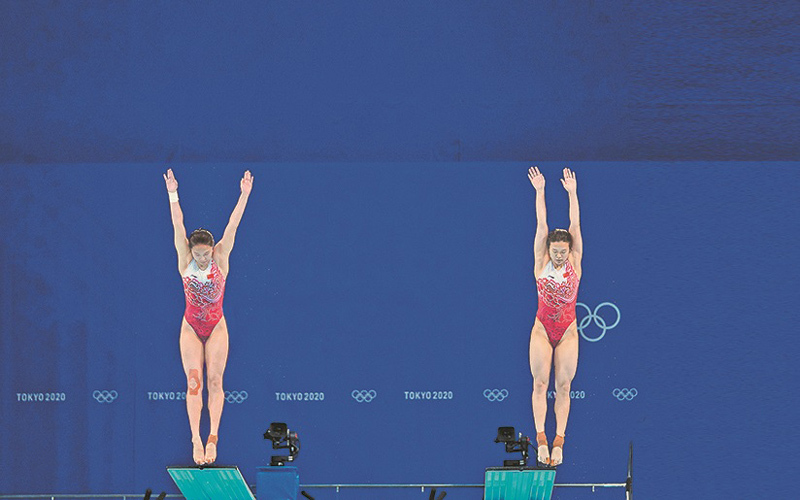 七月二十五日,中國選手施廷懋(右)\王涵在比賽中。本組圖片均由新華社發(fā)
