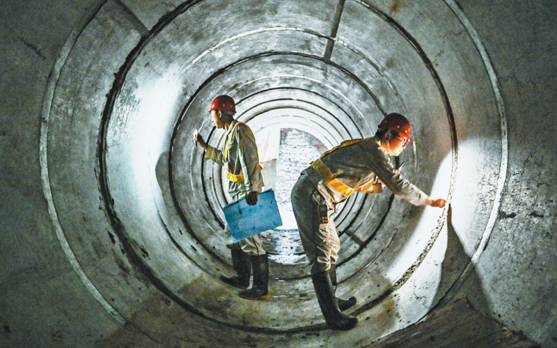 7月26日,西部(重慶)科學城,110千伏學山南北線三標段施工現(xiàn)場,工作人員正在檢查隧道壁。