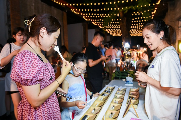 紅墻黑瓦下琳瑯滿目的攤位,扣人心弦的民謠曲,現(xiàn)場獨特的歷史氣息,以及拍照打卡的年輕人與手搖蒲扇的老居民一起在夜市中漫步。