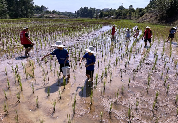 人民網(wǎng)重慶7月31日電 31日,渝北興隆鎮(zhèn)牛皇村農(nóng)業(yè)專業(yè)合作社的晚稻田里迎來了一群小農(nóng)人,他們脫下鞋子,挽起褲腿,在叔叔伯伯的帶領下,為稻田施肥、除草。他們是參加“暑期課堂”的中小學生。