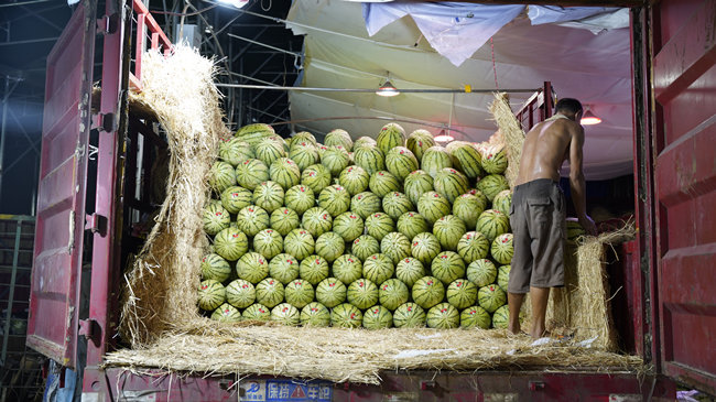 一輛輛運輸車運來了一個個大西瓜。吳汪洋攝