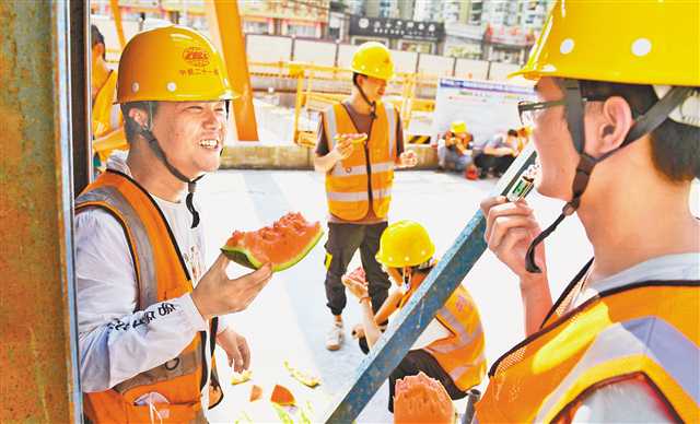 據(jù)承建方中鐵二十一局集團(tuán)五公司介紹,隨著重慶連晴高溫天氣的到來,該單位目前在建14個項(xiàng)目已全部實(shí)行錯峰上班,并在各工地配備防暑降溫藥品、飲品和水果,在保障生產(chǎn)安全前提下確保工期。