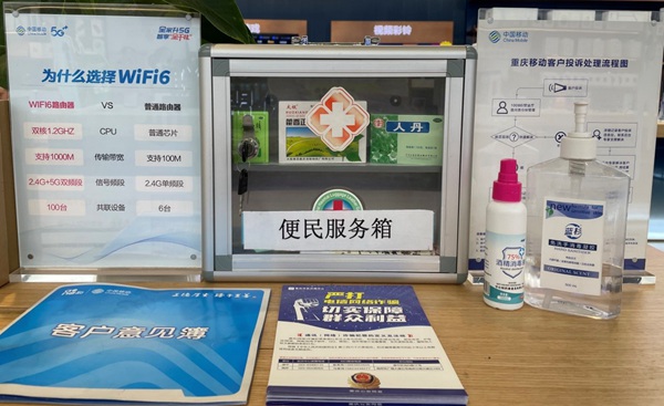 重慶移動(dòng)營(yíng)業(yè)廳為客戶提供的消暑防疫物品。重慶移動(dòng)公司供圖