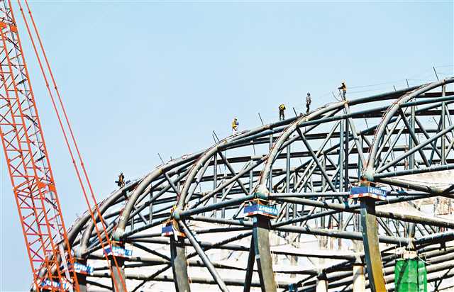 8月4日,兩江新區(qū),中建八局職工正加緊龍興足球場鋼結(jié)構(gòu)罩棚施工。龍興足球場是我市打造的首座專業(yè)足球場,2023年將承辦足球亞洲杯。