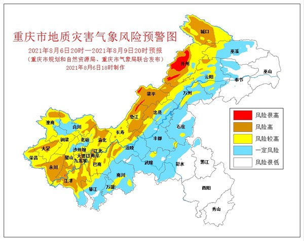 8月6日20時至8月9日20時,墊江縣、梁平區(qū)、開州區(qū)、江津區(qū)屬于風(fēng)險很高地區(qū),地質(zhì)災(zāi)害氣象風(fēng)險等級為一級(紅色預(yù)警),豐都縣、巫溪縣、城口縣、涪陵區(qū)、忠縣、綦江區(qū)、大足區(qū)、榮昌區(qū)、合川區(qū)、潼南區(qū)、巴南區(qū)、云陽縣、銅梁區(qū)、萬州區(qū)、長壽區(qū)、永川區(qū)、璧山區(qū)、南岸區(qū)、渝中區(qū)、渝北區(qū)、北碚區(qū)、江北區(qū)、沙坪壩區(qū)、大渡口區(qū)、九龍坡區(qū)、兩江新區(qū)屬于高風(fēng)險地區(qū),地質(zhì)災(zāi)害氣象風(fēng)險等級為二級(橙色預(yù)警),南川區(qū)、萬盛經(jīng)開區(qū)、武隆區(qū)、彭水縣、石柱縣屬于風(fēng)險較高地區(qū),地質(zhì)災(zāi)害氣象風(fēng)險等級為三級(黃色預(yù)警),黔江區(qū)、奉節(jié)縣屬于一定風(fēng)險地區(qū),地質(zhì)災(zāi)害氣象風(fēng)險等級為四級(藍(lán)色預(yù)警)。