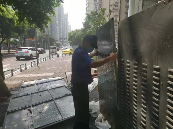 城管隊員在洋河花園社區(qū)清理倒塌圍欄。觀音橋街道供圖