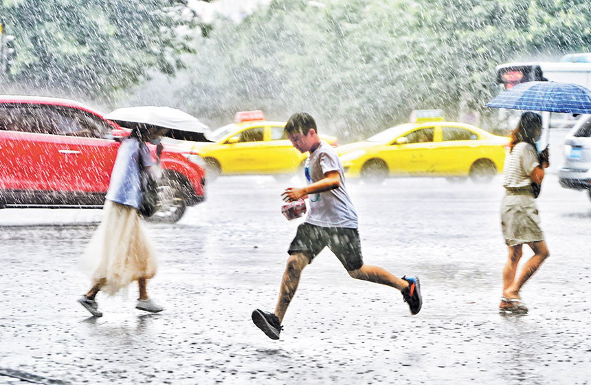 8月5日下午,南岸區(qū)騰龍大道,市民冒雨前行。當(dāng)日白天,我市大部地區(qū)多云到晴,局部地區(qū)出現(xiàn)陣雨或雷雨,其中,兩江新區(qū)龍頭寺公園達(dá)暴雨級(jí)別。江北、渝北、南岸、九龍坡、江津、墊江、開(kāi)州等8個(gè)區(qū)縣的局部地區(qū)出現(xiàn)8至9級(jí)陣性大風(fēng)。