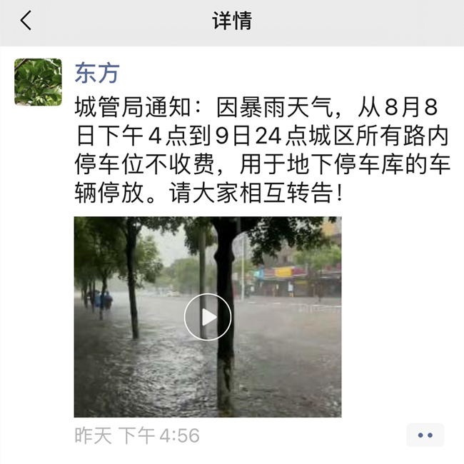 “因暴雨天氣,從8月8日下午4點到9日24點,城區(qū)所有路內停車位不收費,用于地下停車庫的車輛停放。請大家相互轉告!”迎戰(zhàn)暴雨的各項準備工作中,城管部門“路內停車位不收費”的通知刷屏了。