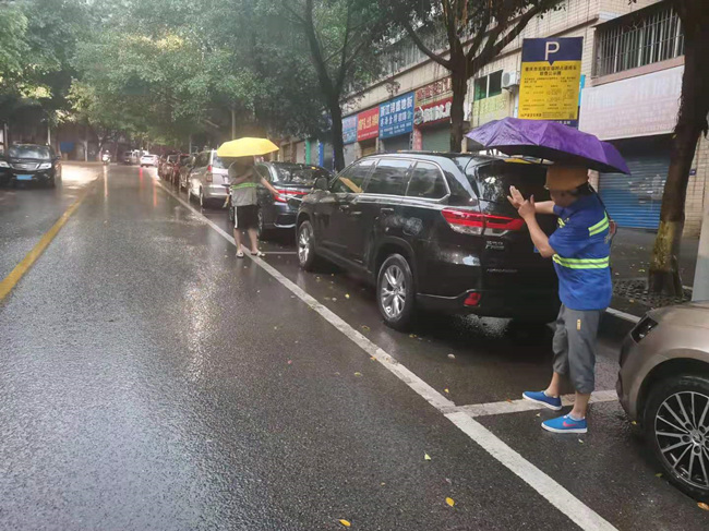 他們還前往水淹風險高的車庫引導和告知,聯(lián)動物管和管理員盡快通知車主。車子上了地面,加強路內停車安全保障,也是預案的內容之一。