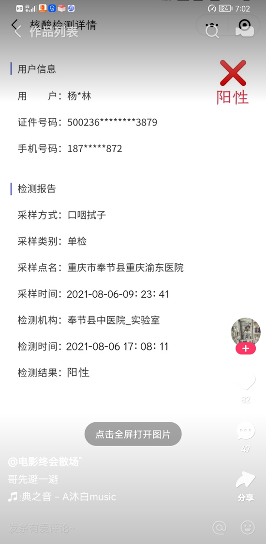 經(jīng)查實,違法行為人楊某林(男,19歲,奉節(jié)縣朱衣鎮(zhèn)人,有多次盜竊前科)為博人眼球,于8月8日通過手機自帶編輯軟件將核酸檢測“陰性”結(jié)果修改為“陽性”,并通過網(wǎng)絡(luò)平臺散布傳播,引發(fā)公眾恐慌,造成不良影響。