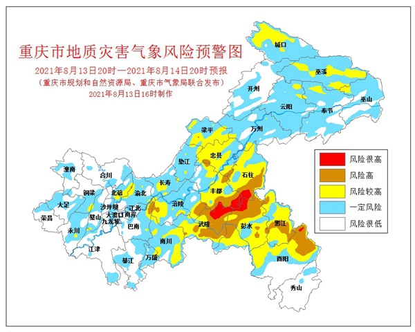 8月13日20時至8月14日20時,豐都縣、石柱縣、彭水縣、武隆區(qū)、酉陽縣屬于風(fēng)險很高地區(qū),地質(zhì)災(zāi)害氣象風(fēng)險等級為一級(紅色預(yù)警),涪陵區(qū)、忠縣、梁平區(qū)、黔江區(qū)、巴南區(qū)、北碚區(qū)屬于高風(fēng)險地區(qū),地質(zhì)災(zāi)害氣象風(fēng)險等級為二級(橙色預(yù)警),云陽縣、巫溪縣、奉節(jié)縣、巫山縣、長壽區(qū)、墊江縣、南川區(qū)、城口縣、萬州區(qū)、萬盛經(jīng)開區(qū)、渝北區(qū)、永川區(qū)、璧山區(qū)、銅梁區(qū)屬于風(fēng)險較高地區(qū),地質(zhì)災(zāi)害氣象風(fēng)險等級為三級(黃色預(yù)警),江津區(qū)、綦江區(qū)、江北區(qū)、南岸區(qū)、秀山縣、開州區(qū)、榮昌區(qū)、潼南區(qū)、合川區(qū)、大足區(qū)、渝中區(qū)、兩江新區(qū)、沙坪壩區(qū)、大渡口區(qū)、九龍坡區(qū)屬于一定風(fēng)險地區(qū),地質(zhì)災(zāi)害氣象風(fēng)險等級為四級(藍(lán)色預(yù)警)。